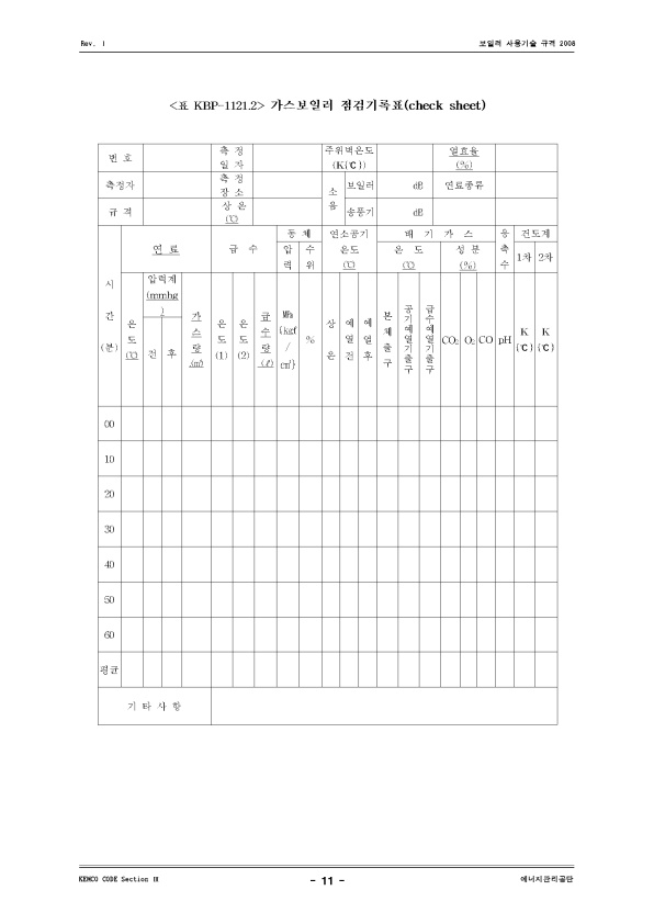 라. 안전관리 및 운전효율과 관련된 제반 점검사항을 보일러운전관리일지에 기록ㆍ관리하여야 한다. 일반적인 운전관리 일지는 <표 KBO-1121.1>에 따르며, 연료의 종류에 따른 점검기록은 <표 KBO-1121.2> ~ <표 KBO-1121.4>에 따른다.