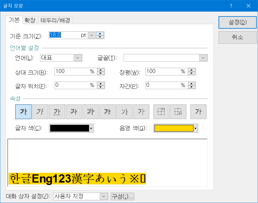 글자 모양을 메뉴에서 선택해 보았습니다. 한컴 오피스의 모습 그대로 인듯 합니다.