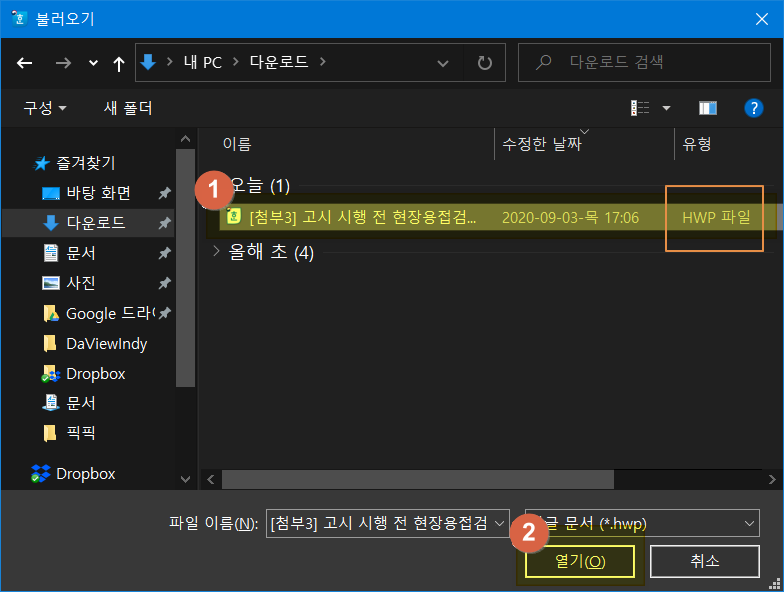 1번 한글 문서, HWP 파일을 찾아서 선택하고 2번 <열기>를 누릅니다.