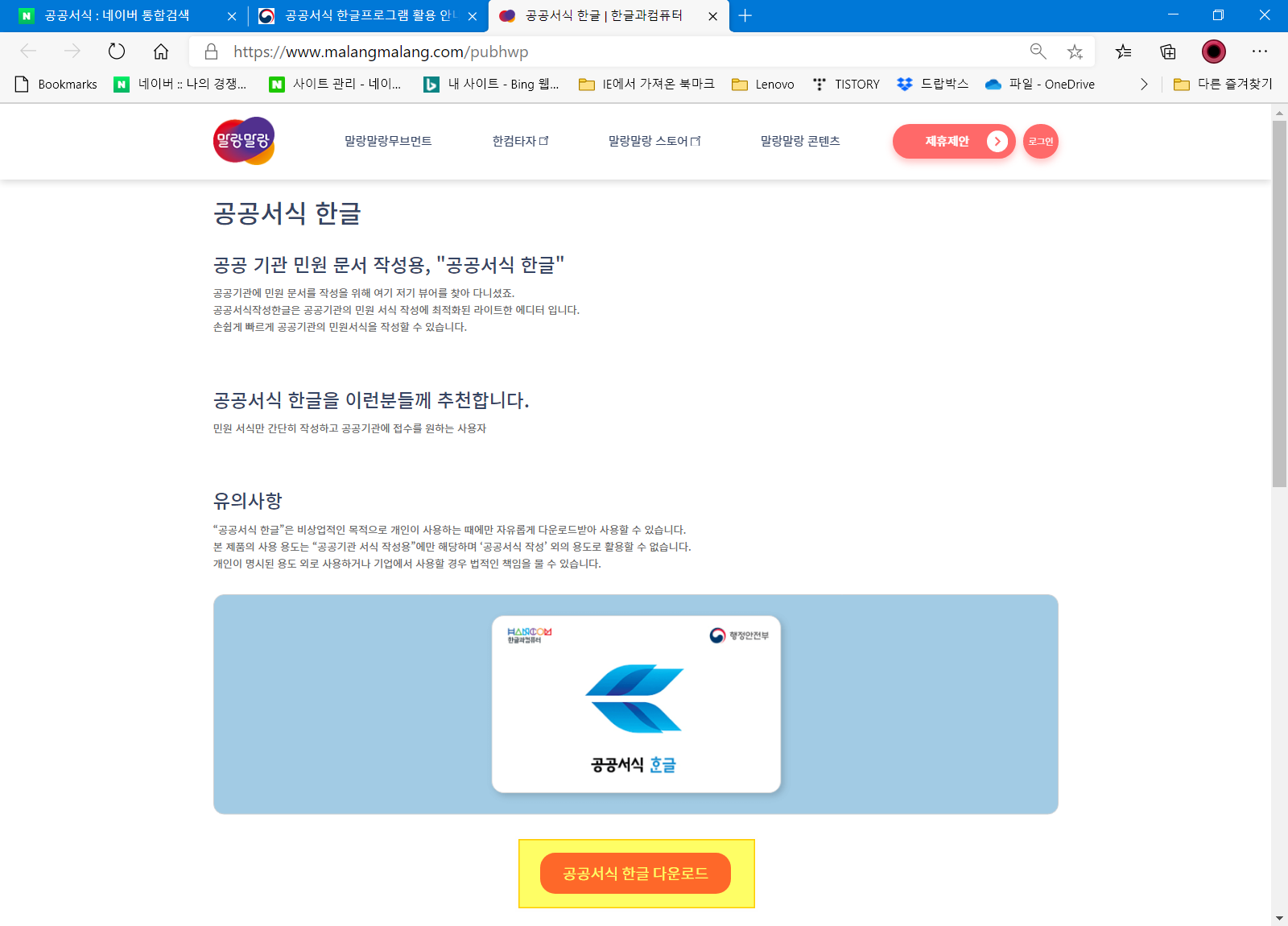 공공서식 한글 프로그램 다운로드 사이트로 접속합니다. <공공서식 한글 다운로드>를 누르세요.