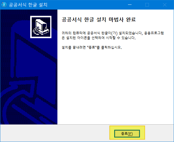 설치가 참 빠릅니다. <종료>를 눌러주세요.