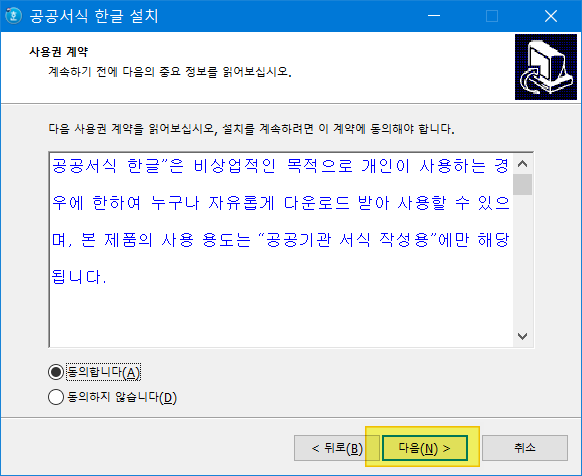<동의합니다>에 체크를 합니다. 동의하지 않습니다에서는 다음으로 넘어갈 수 없습니다.