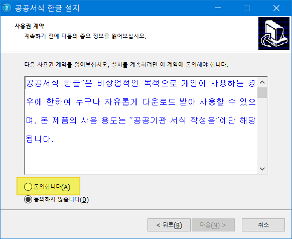 <동의합니다>에 체크를 합니다. 동의하지 않습니다에서는 다음으로 넘어갈 수 없습니다.