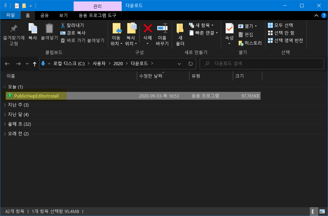 한글뷰어, 공공서식 한글 설치 파일이 다운로드 폴더에서 찾을 수 있습니다. 설치 파일을 실행합니다.
