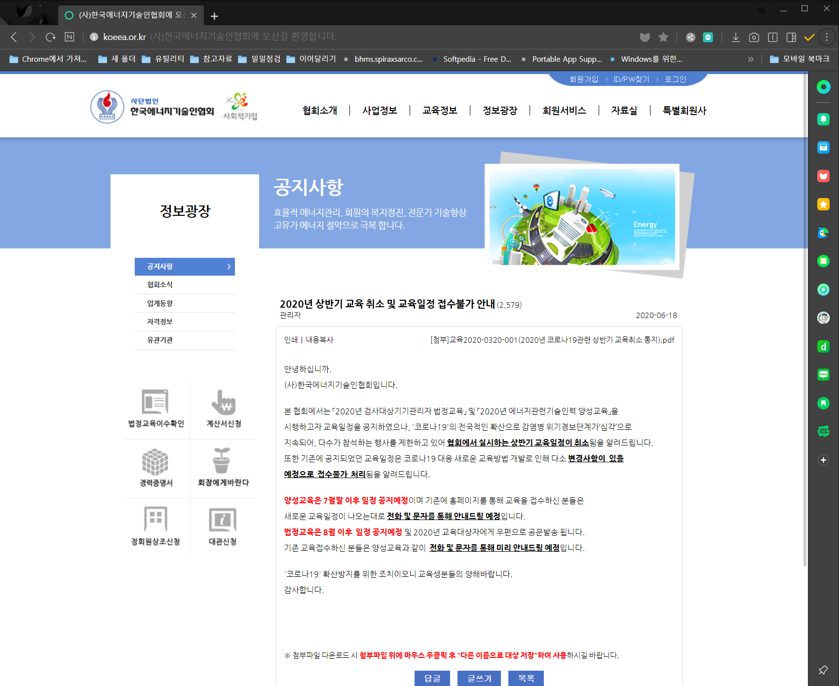 검사대상기기관리자 법정교육, 인정검사대상기기관리자 양성교육, 가스용보일러 관리자 양성교육 취소 및 교육일정 접수 불가가 안내 2020년 6월 18일 자로 한국에너지기술인협회 홈페이지에 아래와 같이 공지되었습니다.