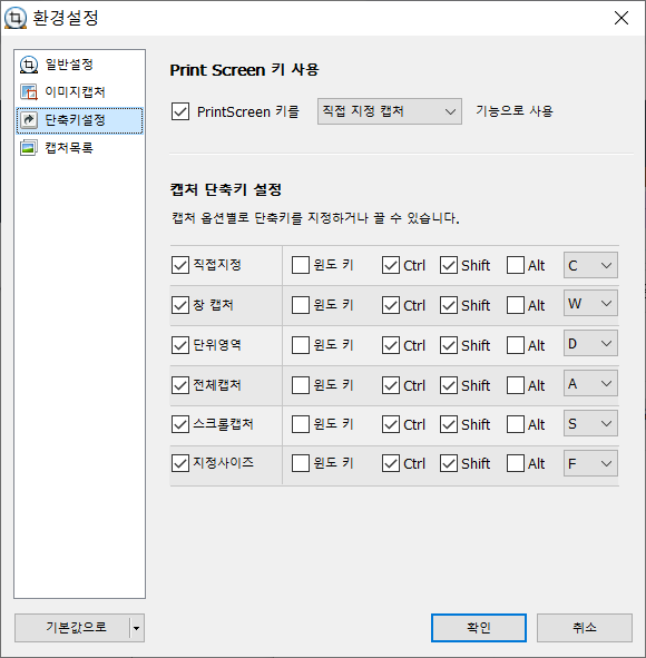 기본적으로 Print Screen 키를 사용하고 있습니다. 그 외 직접 다양한 기능 키를 설정하여 다른 프로그램과 겹치지 않도록 단축키 설정도 가능하므로 매우 편리합니다.