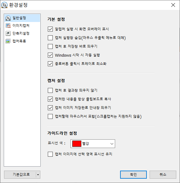 알캡쳐의 환경설정을 열어보았습니다. 기본 설정과 캡쳐 설정이 세밀하게 조정할 수 있고, 표시선 색을 원하는 데로 바꿀 수 있게 되어 있어 사용자 친화적인 모습을 보여줍니다.