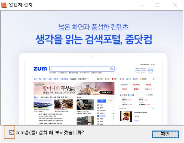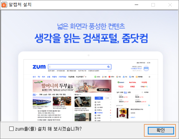 단, 설치 시 ZUM을 기본 홈페이지로 설정하는 체크박스가 있으며 추가 프로그램을 설치하는 옵션이 있습니다. 설치 시에 깨끗하게 알캡쳐만 설치하길 원하다면 신경 써야 할 부분입니다.