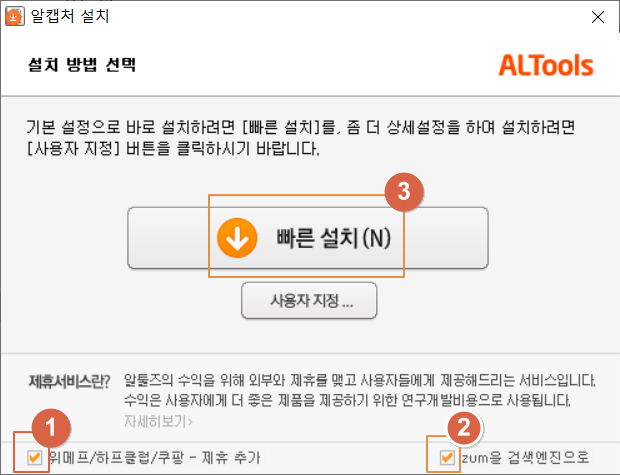 1번 <위메프/하프클럽/쿠팡 제휴 추가>와 2번 <zum을 검색엔진으로>는 체크 해제한 후 3번 <빠른 설치>를 누릅니다.