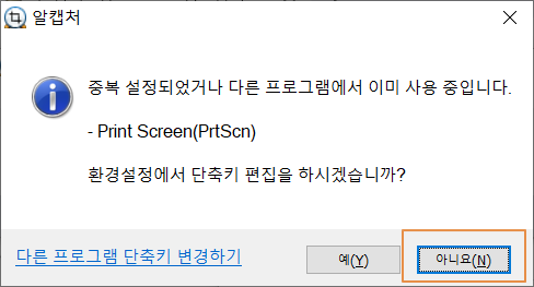 기존에 다른 프로그램에서 이미 Print Screen 키를 단축키로 사용하고 있을 때 나오는 메시지입니다. 일단 <아니오>를 선택하고 다른 프로그램과 비교하여 변경하는 것이 나을 듯합니다.