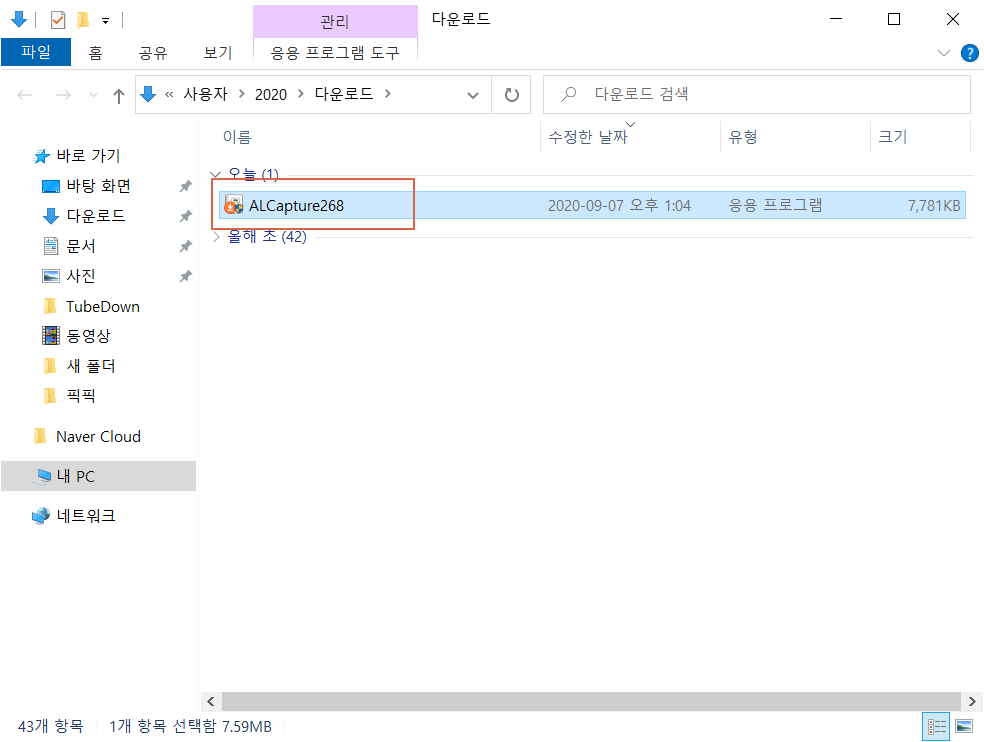 다운로드 폴더로 이동하면 알캡쳐 설치 프로그램이 저장되어있습니다. 설치 파일을 실행합니다.