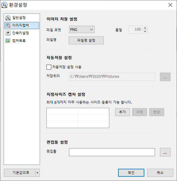 기본적으로 Print Screen 키를 사용하고 있습니다. 그 외 직접 다양한 기능 키를 설정하여 다른 프로그램과 겹치지 않도록 단축키 설정도 가능하므로 매우 편리합니다.