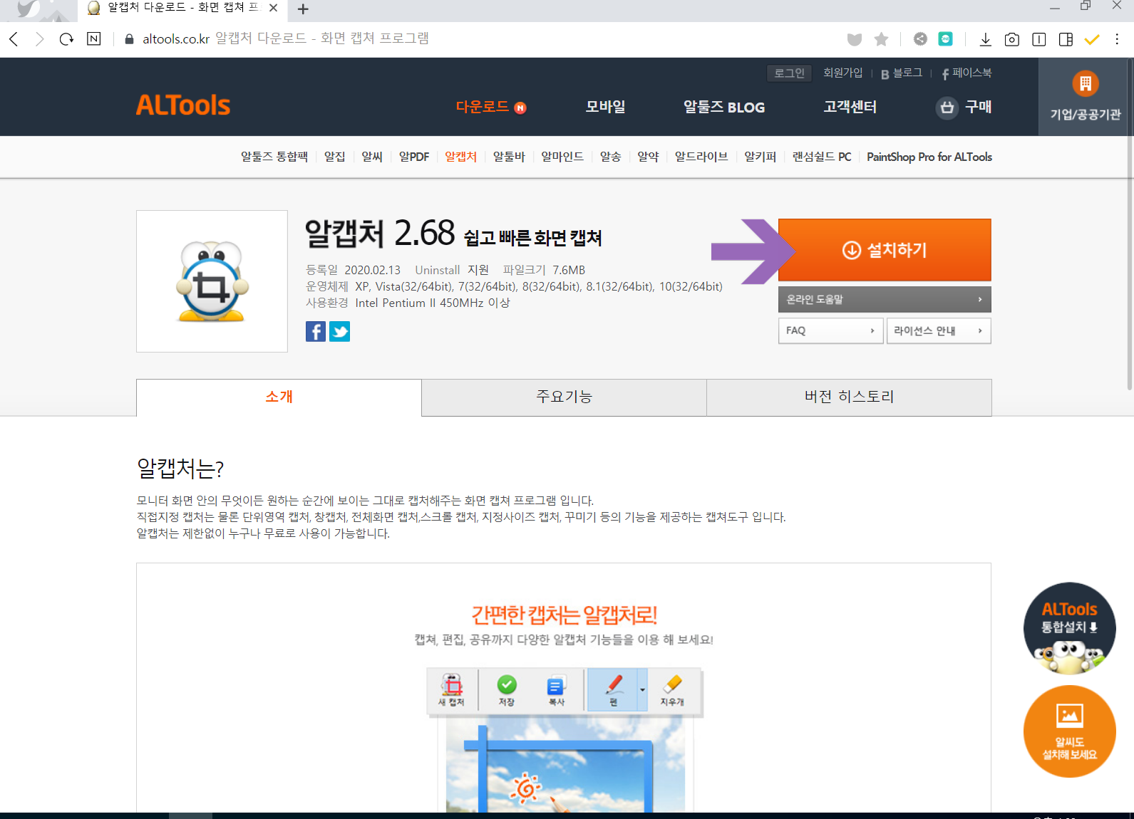 알캡쳐 홈페이지로 이동합니다. <설치하기>를 누릅니다.