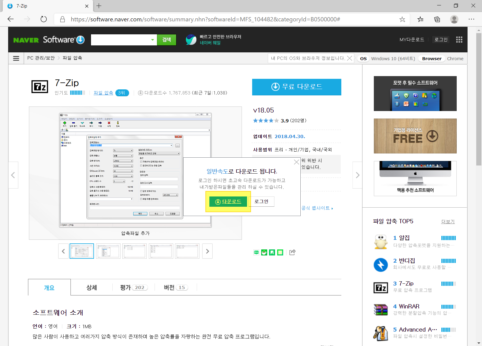 네이버 소프트웨어 자료실에서 7 zip 압축 프로그램 페이지로 이동합니다. <무료 다운로드>를 누릅니다.