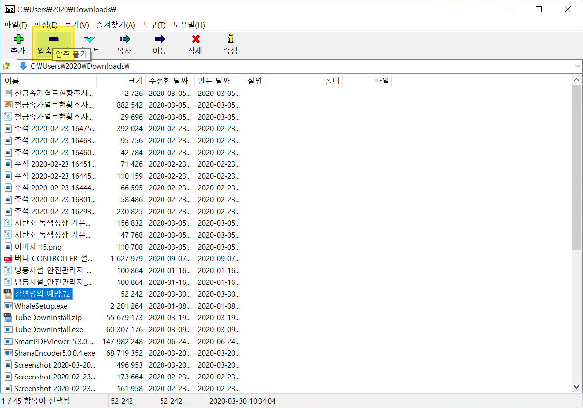 상단 메뉴에 <압축 풀기>를 누릅니다.