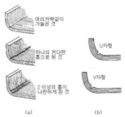 [그림 KRM-0800.28](a)와 같이 홈 모양의 선으로 부식되는 것을 말한다. 그루빙은 그 홈 의 단면형상에 따라 (b)와 같이 U자형과 V자형으로 나누며, U자형은 외관의 입구가 커서 그 깊이 끝이 어디까지 진행되어 있는지 판정하기 쉬우나, V자형은 외관상 입구가 좁아 그 깊이 끝이 어디까지 진행되어 있는지 판정하기 어렵다.