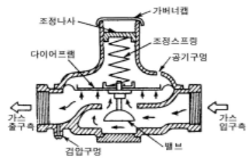 가스의 공급압력을 일정압으로 제어, 유지하는 감압밸브의 일종으로. 거버너라고도 부른다. [그림 KRM-0800.5]와 같이 압력조정은 스프링으로 행하여지며, 조정기의 입구측 압력이 너무 높으면 다이어프램이 위로 밀어 올려지고, 이와 함께 밸브가 당겨 올려져 밸브의 개도 가 좁아지며 이로 인해 가스유량이 감소함으로서 출구측의 가스압력이 낮아진다. 역으로 입 구측의 가스압력이 너무 낮을 때는 그 반대의 동작을 한다. 설정압력(출구측 가스압력)을 변경할 경우에는 조정나사의 위치를 변경하면 된다.