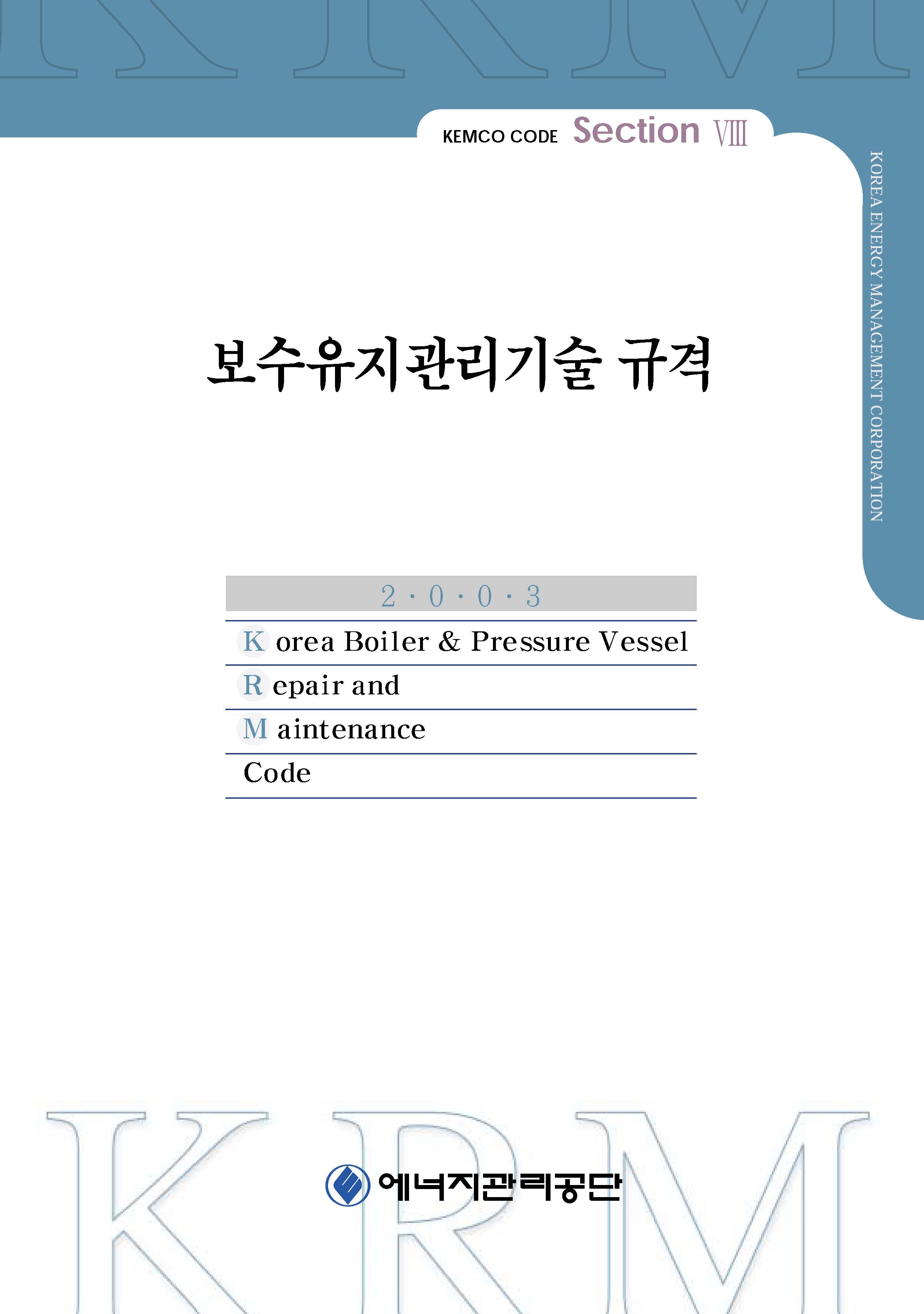 한국에너지공단에서 제정, 공표한 보일러 및 압력용기 보수유지기술 규격 KRM(Korea Boiler & Pressure Vessel Repair and Maintenance Code)은 보일러, 압력용기 및 그 부속기기를 안전하고 효율적인 시스템으로 유지관리하기 위하여 기기 정비에 관한 기술적 요건 세부사항을 규정한 기술지침서로서 관련직무 종사자들이 활용할 수 있도록 기술위원회를 통해 제정된 자율기술규격입니다.