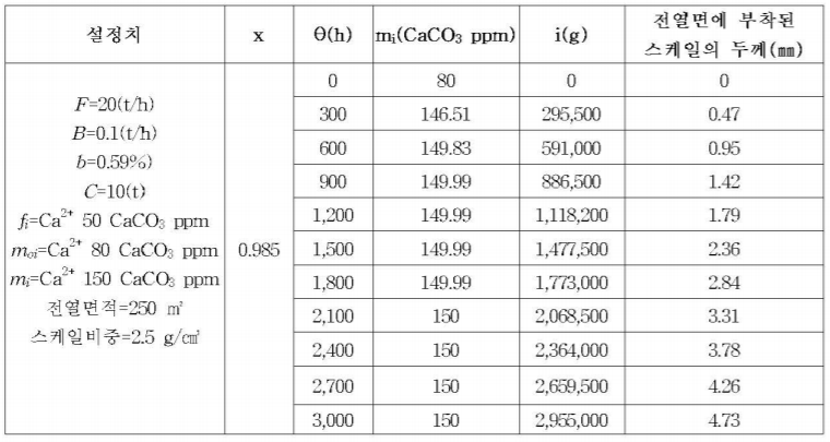 (1) 내처리를 전혀 실시하지 않는 보일러에 50 CaCO3 ppm의 Ca2 + 성분이 함유된 급수가 유입되는 경우 Ca2 + 성분이 블로우된 외에는 그 전량이 스케일화 되었다고 가정하여 가동시간에 따른 스케일 총량을 산출하였다.