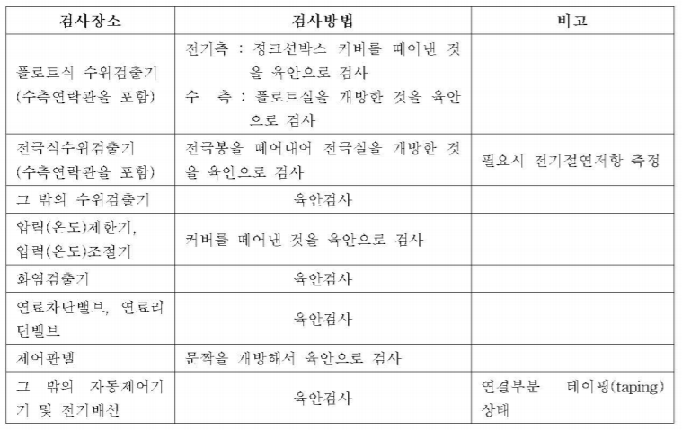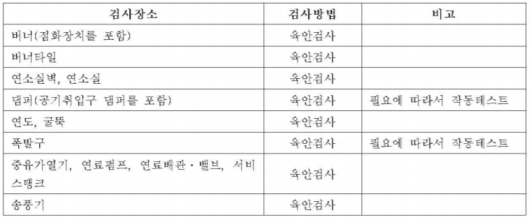 연소장치의 검사부위와 방법은 <표 KBO-9212>와 같다.