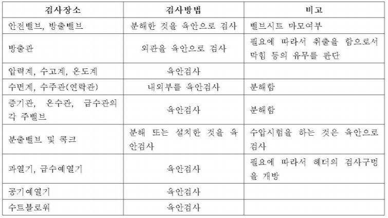 보일러 본체(본체와 정지 밸브까지의 관을 포함)의 검사부위와 방법은 <표 KBO-9211>와 같다.