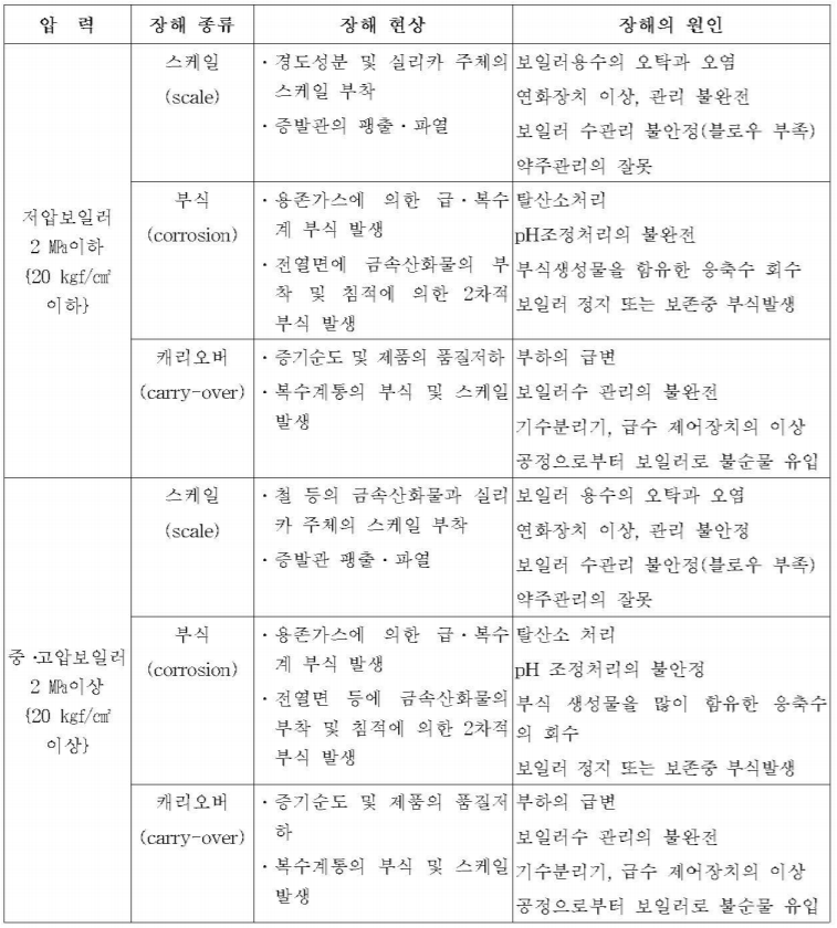 KBO-5113. 보일러의 압력별 장해 현상 및 원인