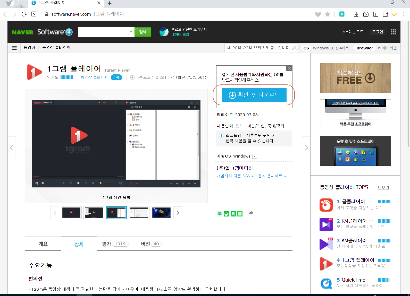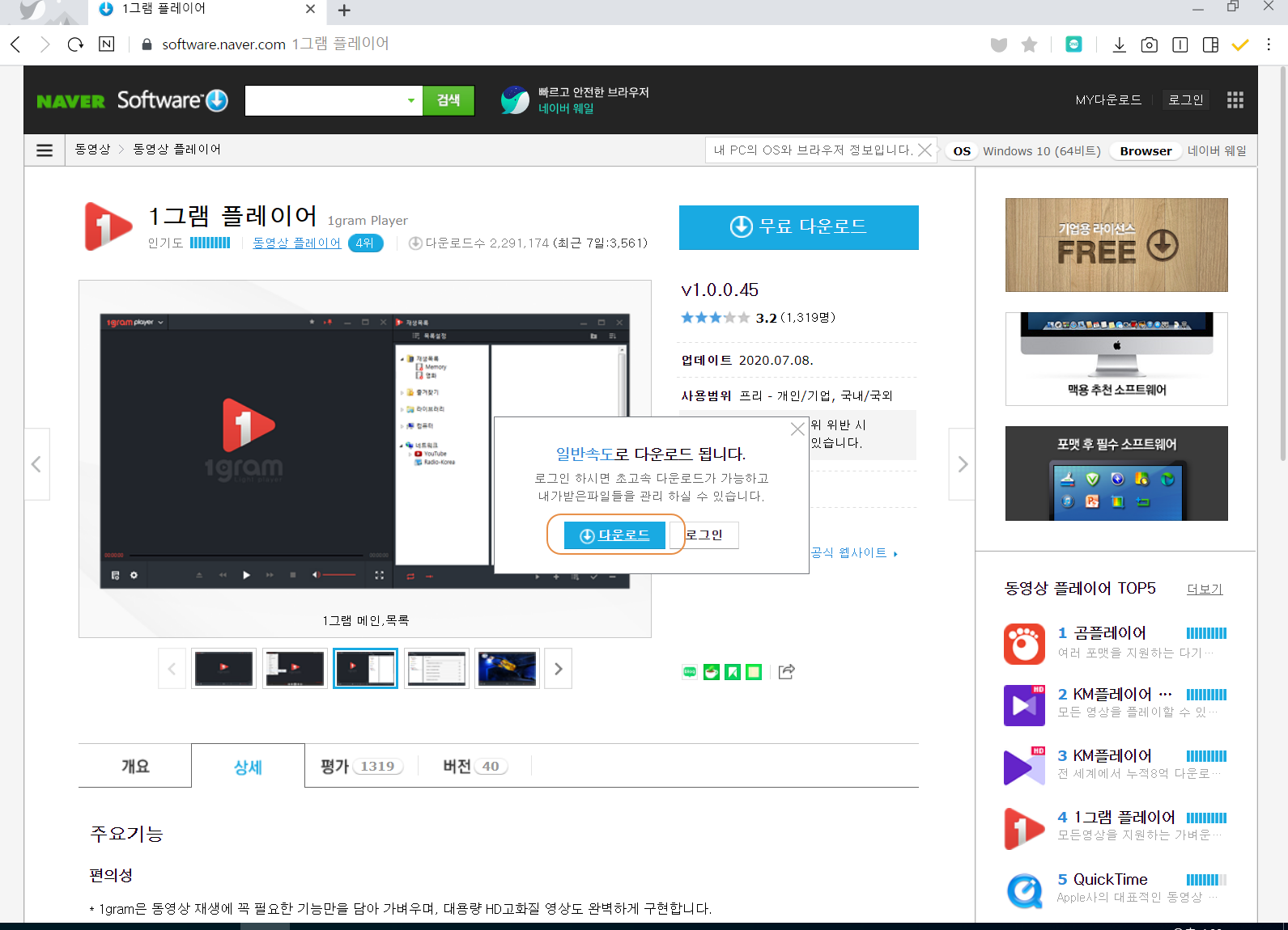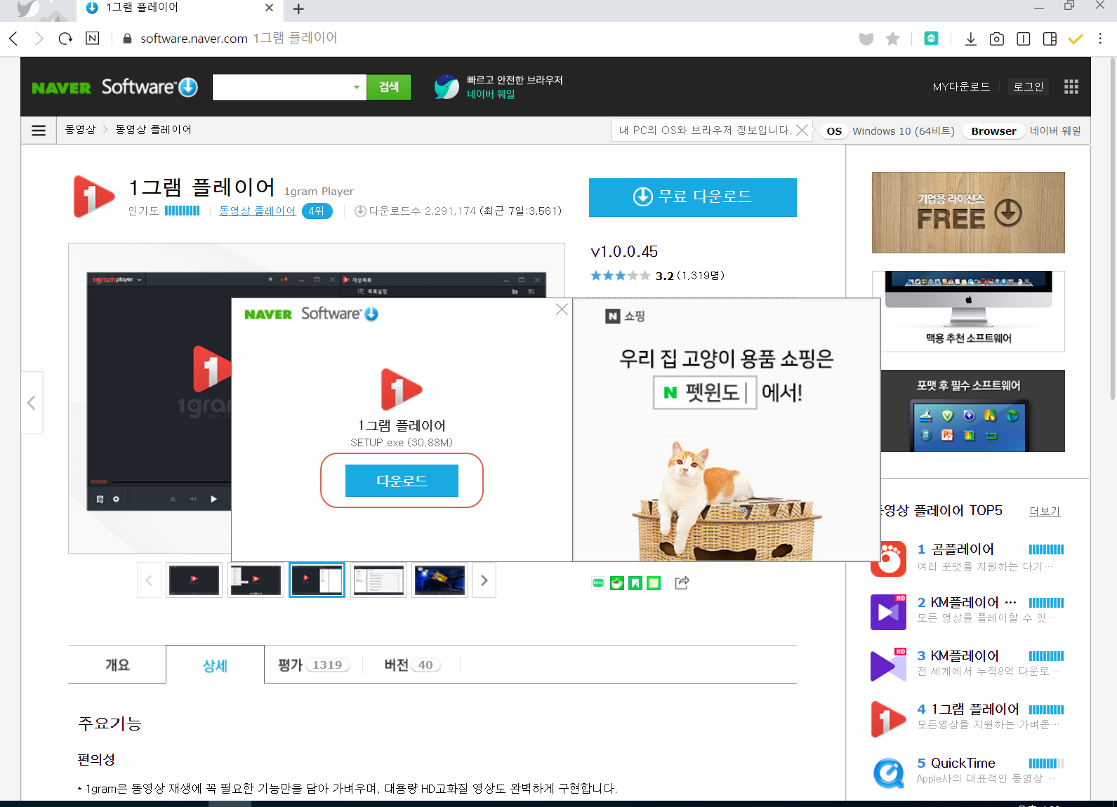네이버 소프트웨어 자료실의 1그램 플레이어(1 gram Player) 다운로드 페이지로 이동합니다. <무료 다운로드>를 눌러줍니다.