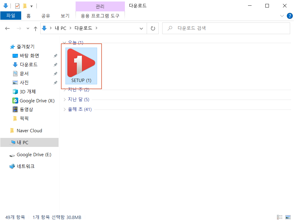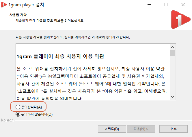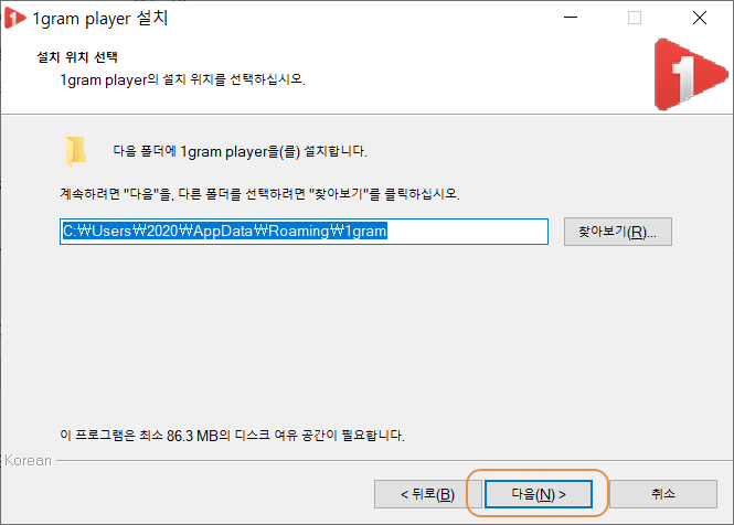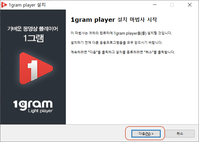 다운로드 경로의 폴더로 이동하면 1그램 플레이어의 설치 파일이 있습니다. 설치 파일을 실행합니다.