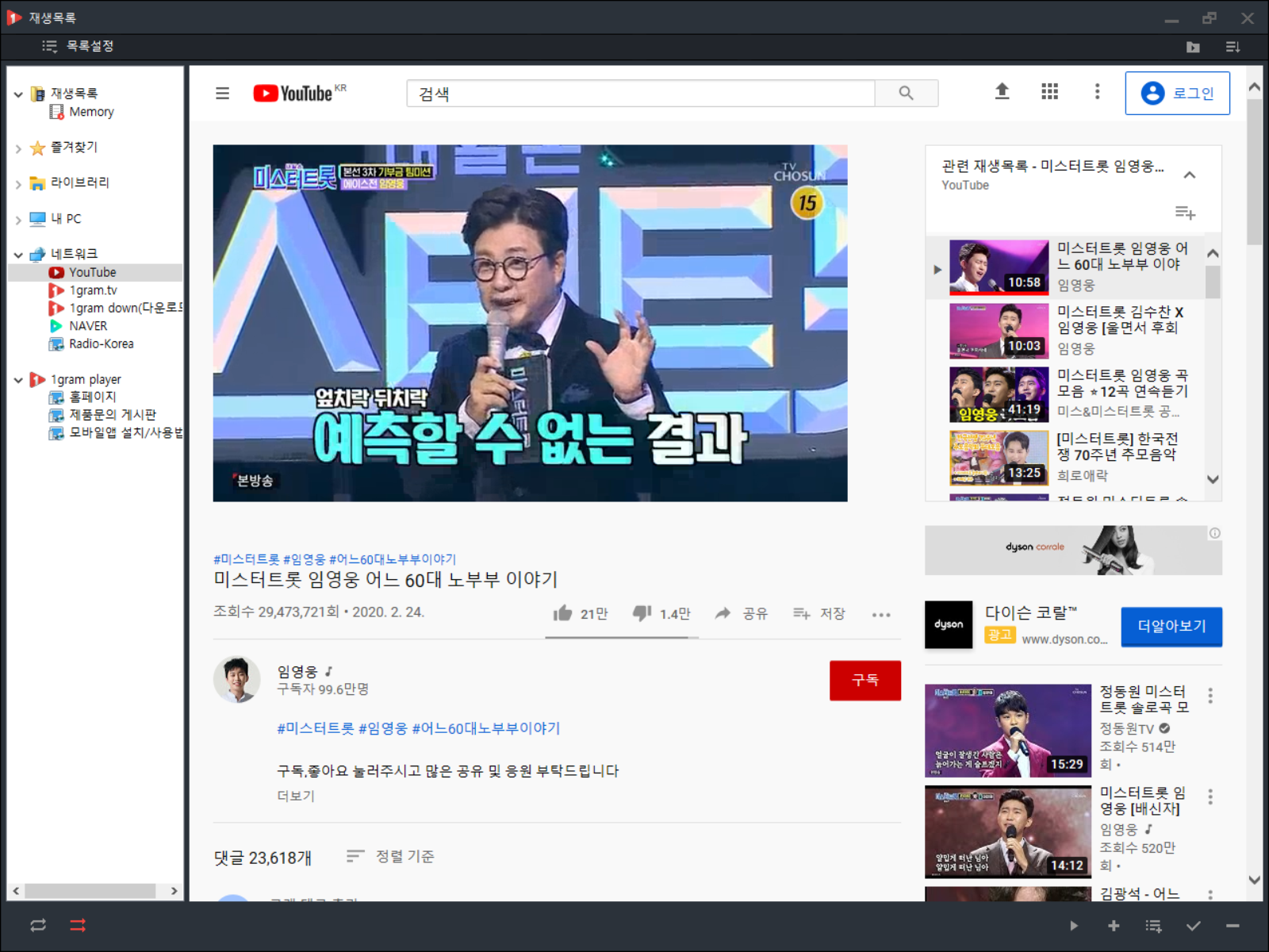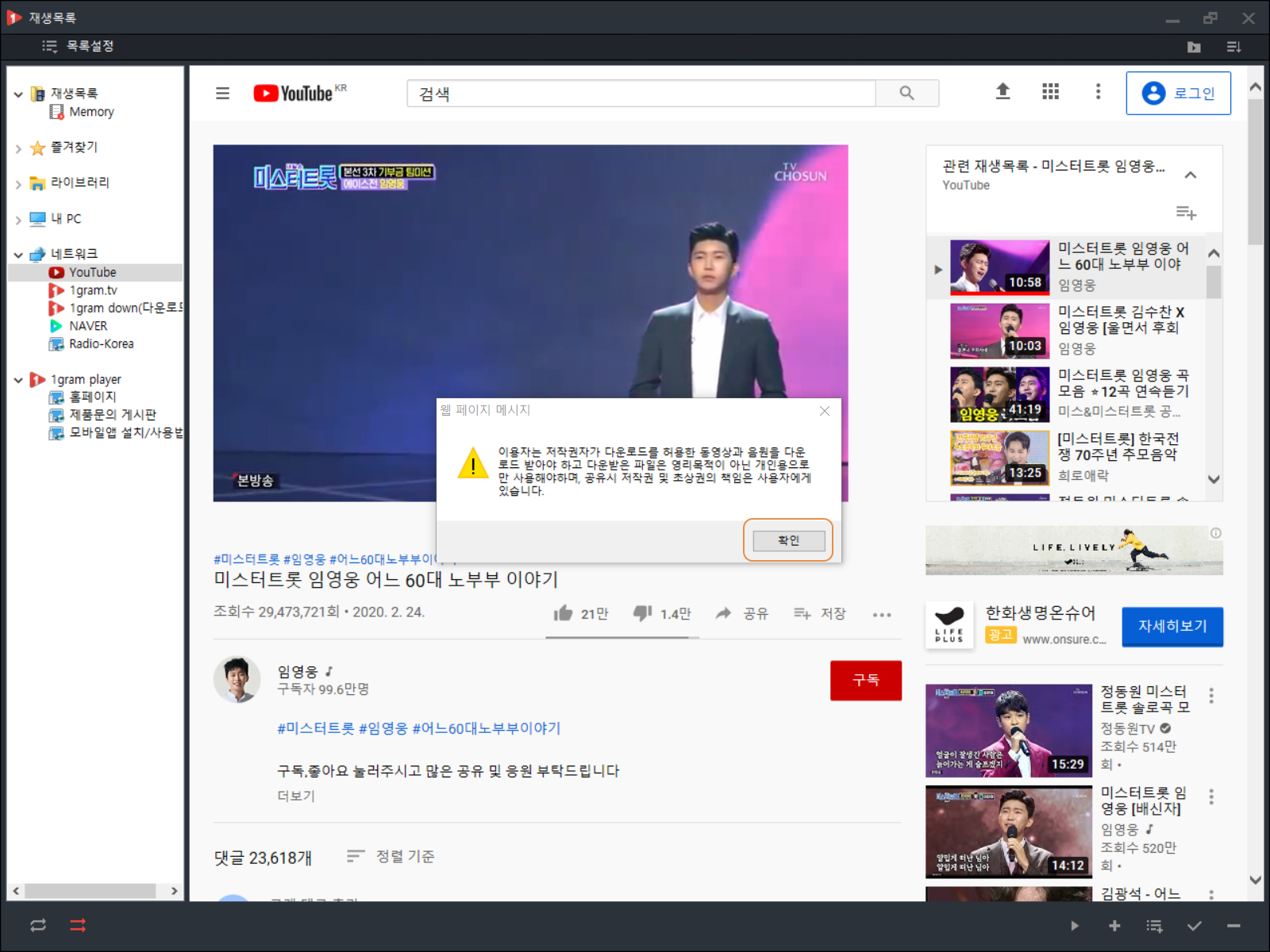 유튜브가 실행됩니다. 원하는 동영상 혹은 음원을 찾아 검색을 해봅니다. 임영웅의 어느 60대 노부부 이야기를 선택하여 음원 추출을 진행해 보도록 하겠습니다.