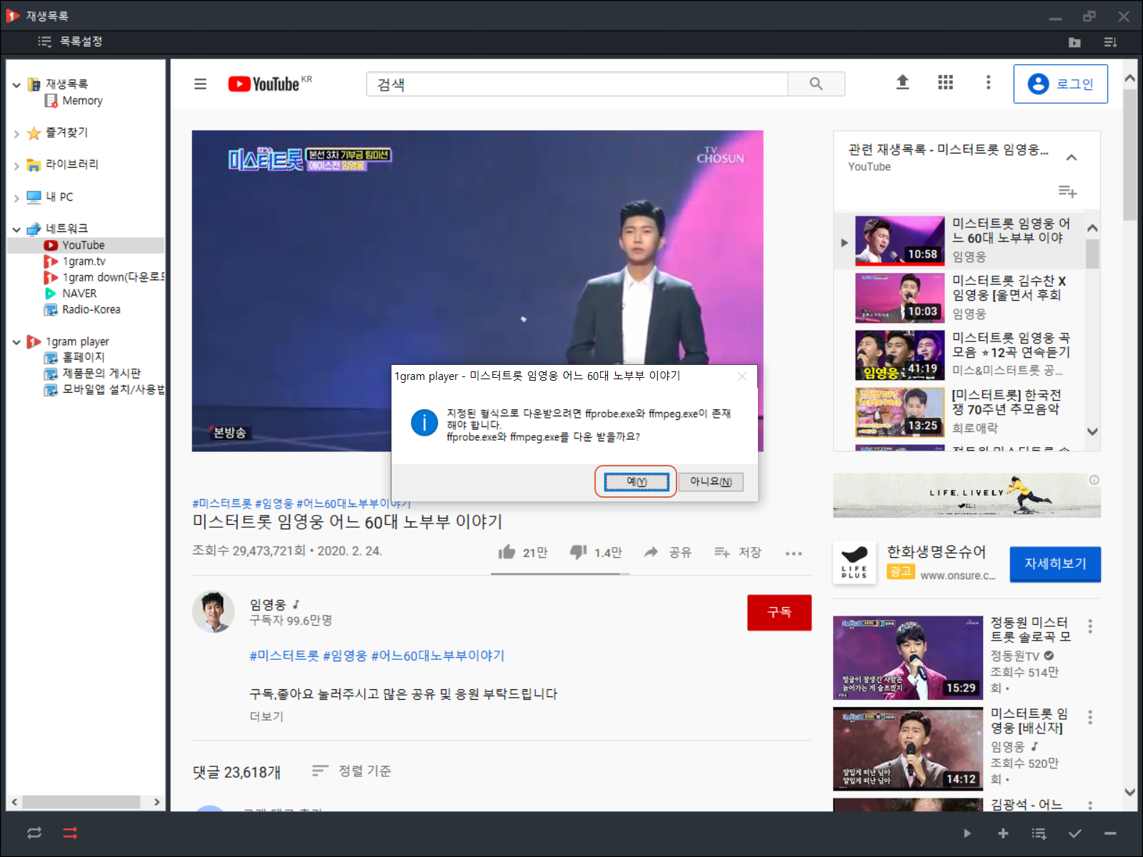 추가로 다운로드해야 될 파일이 있습니다. ffprobe.exe, ffmpeg.exe를 다운로드하여야 하므로 <예>를 누릅니다.