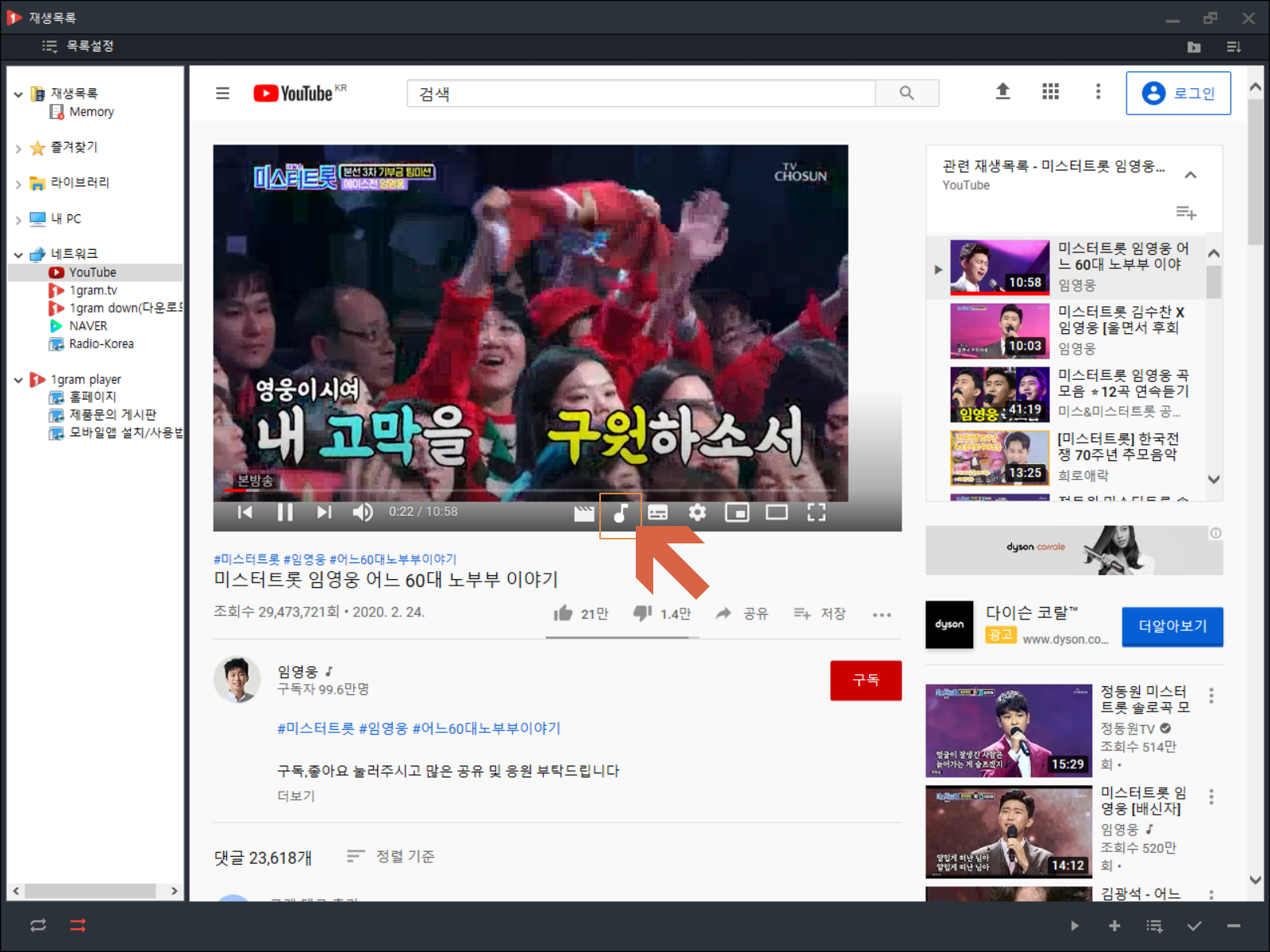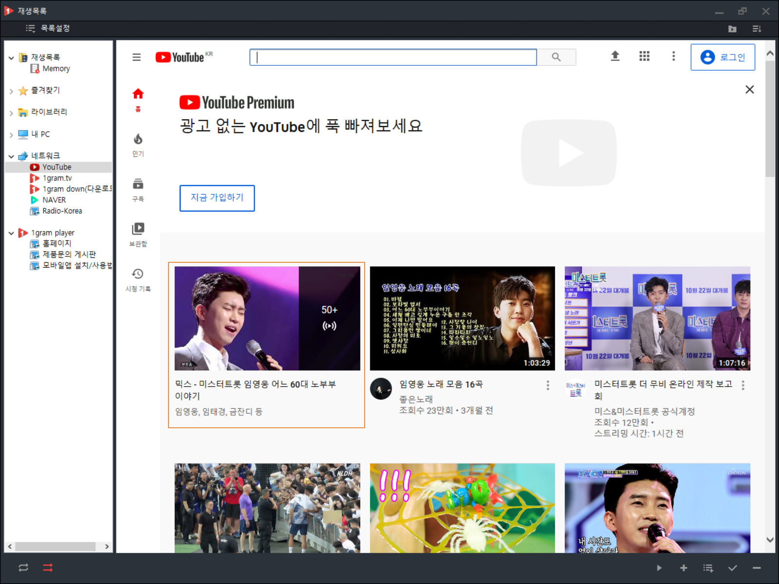 1그램 플레이어를 실행합니다. <유튜브> 아이콘을 누릅니다.