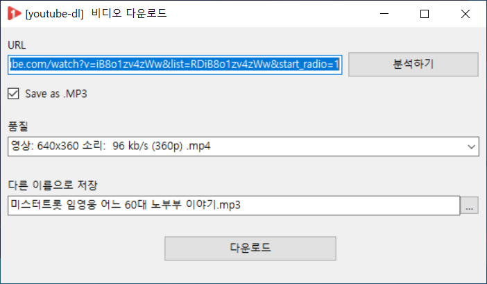 유튜브 음원 추출을 할 수 있는 다운로드 창이 열립니다. 품질과 저장될 이름을 설정하고 <다운로드>를 누릅니다.