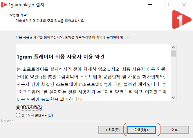 동의하여야만 설치가 진행되므로 <동의합니다>에 체크합니다.