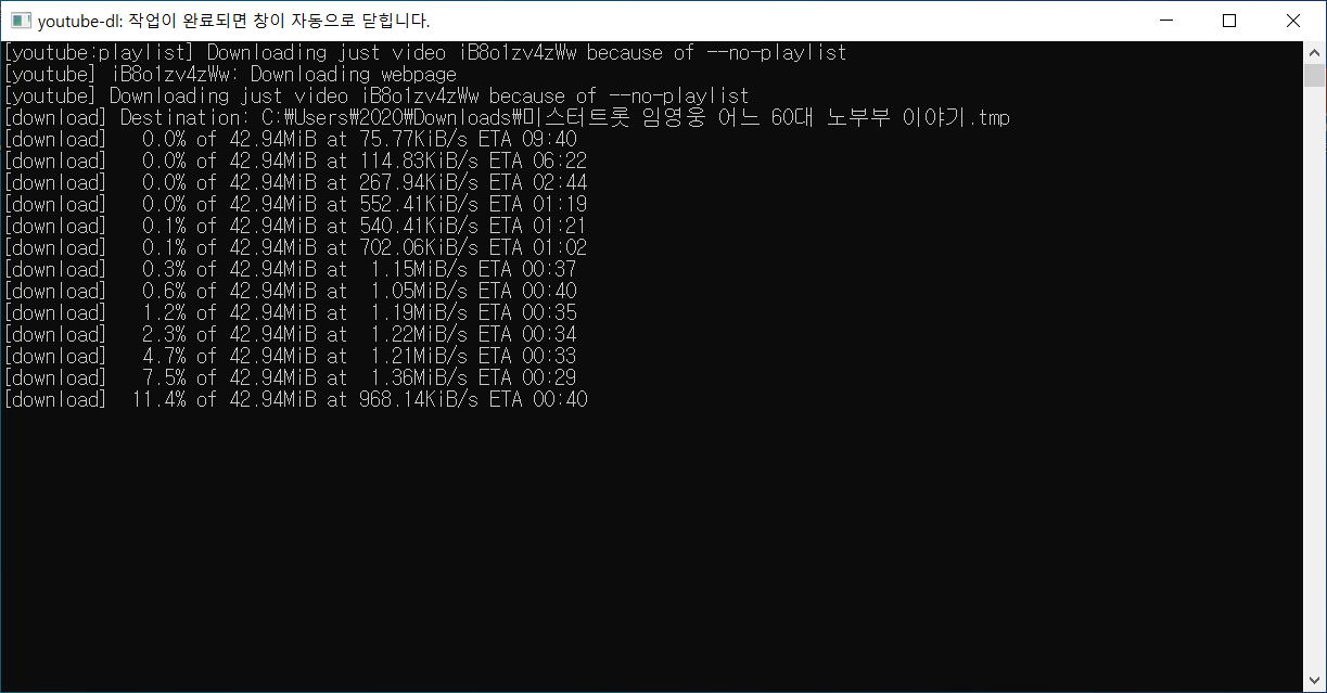 다운로드가 진행되는 모습을 볼 수 있으며, 다운로드가 완료되면 자동으로 창이 닫힙니다.