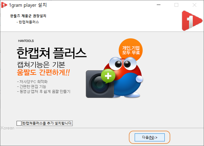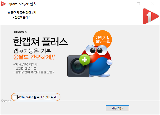 한 캡처 플러스라는 화면 캡처 프로그램을 추가로 설치하려 하지만 1그램 플레이어하고 관계는 없으므로 일단 <한 캡처 플러스를 추가 설치합니다.>에 체크 해제합니다.