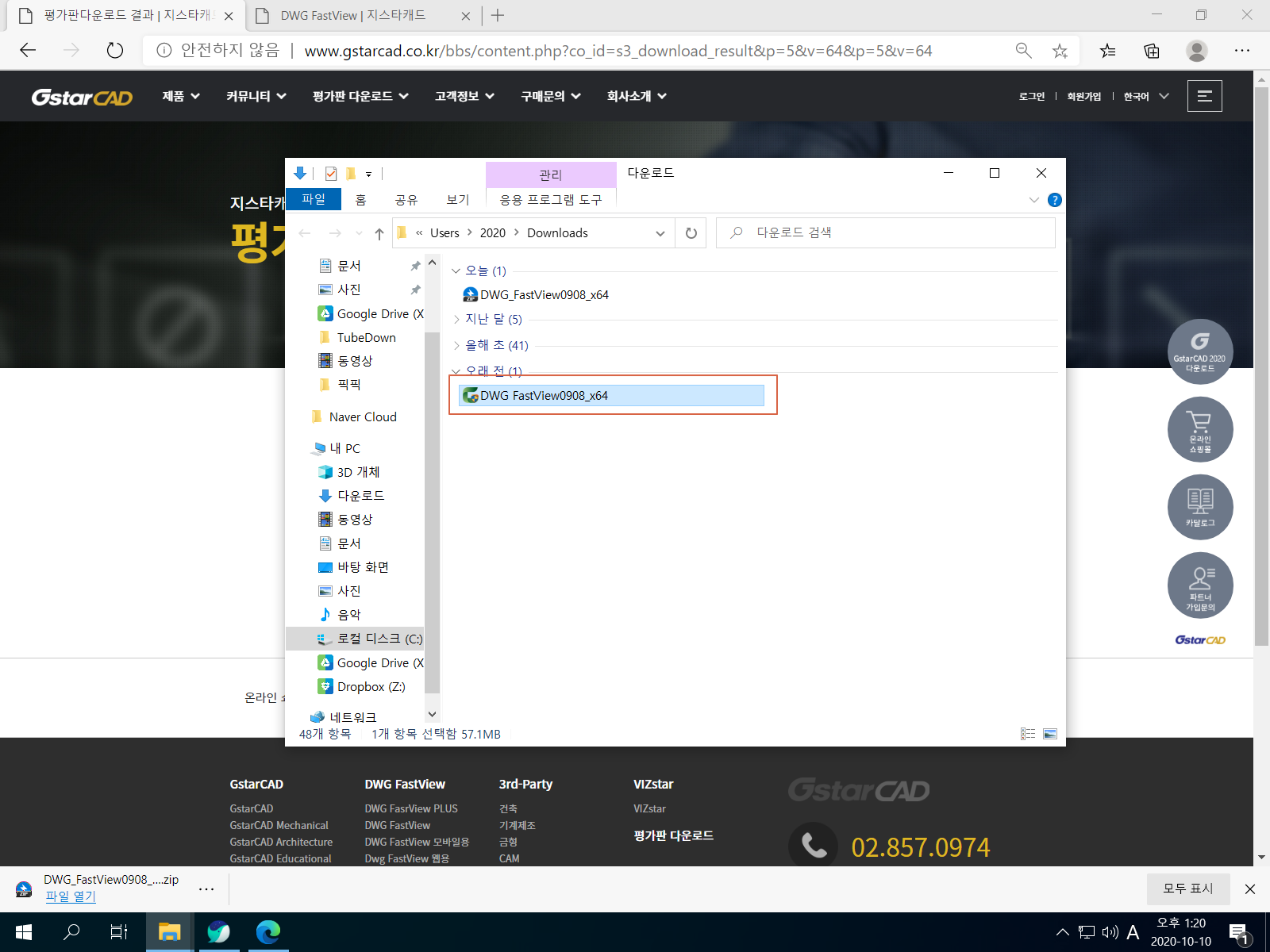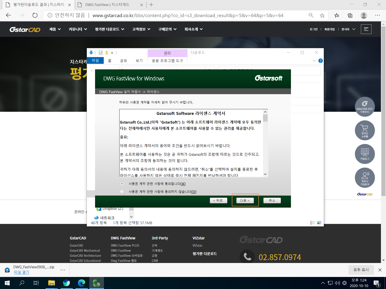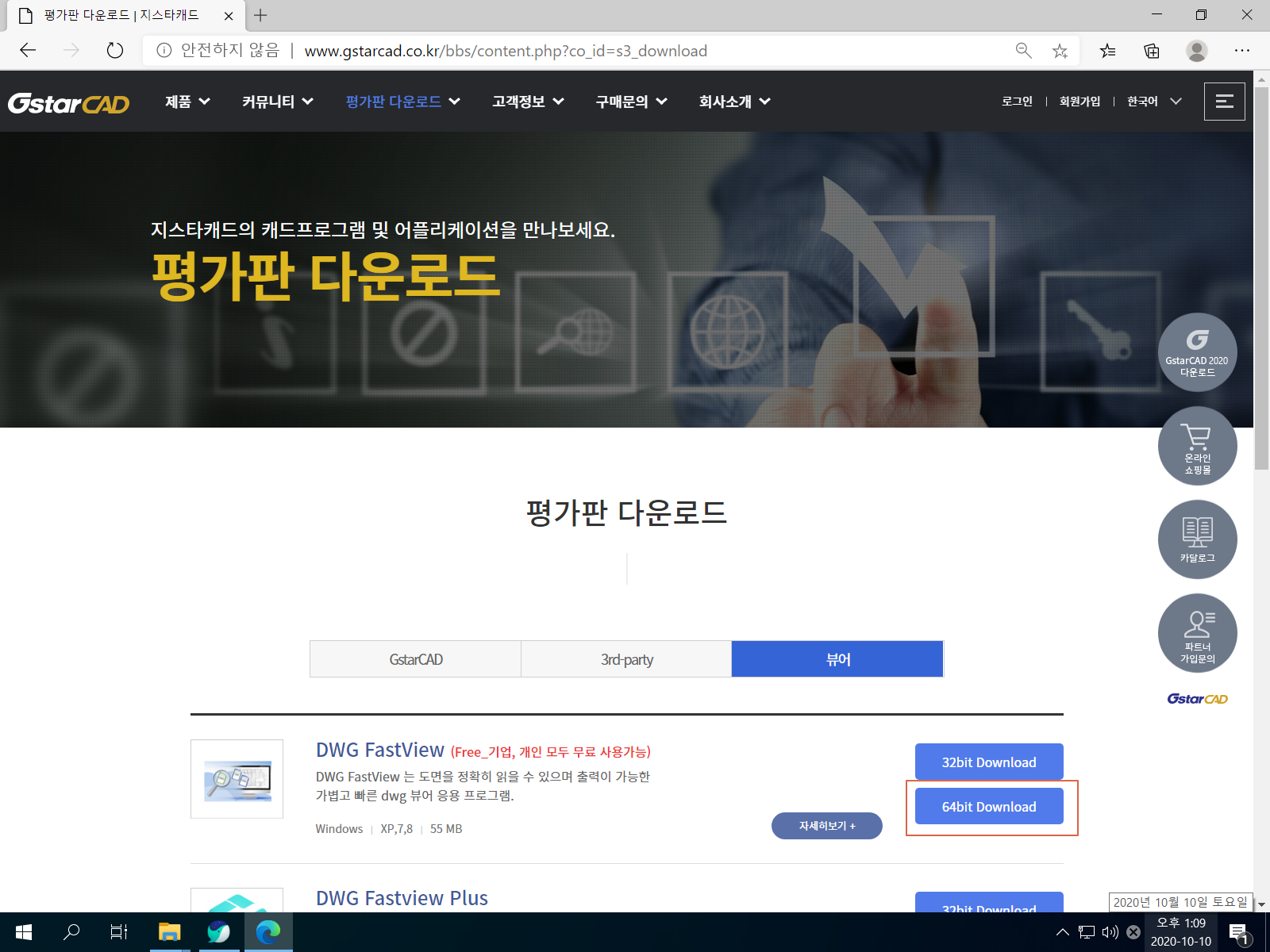 <64bit Download>를 누릅니다. DWG FastView 설치 파일 용량은 약 55MB입니다.