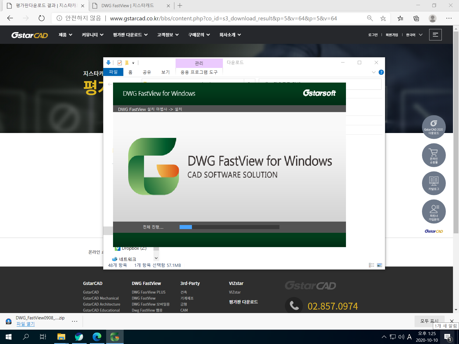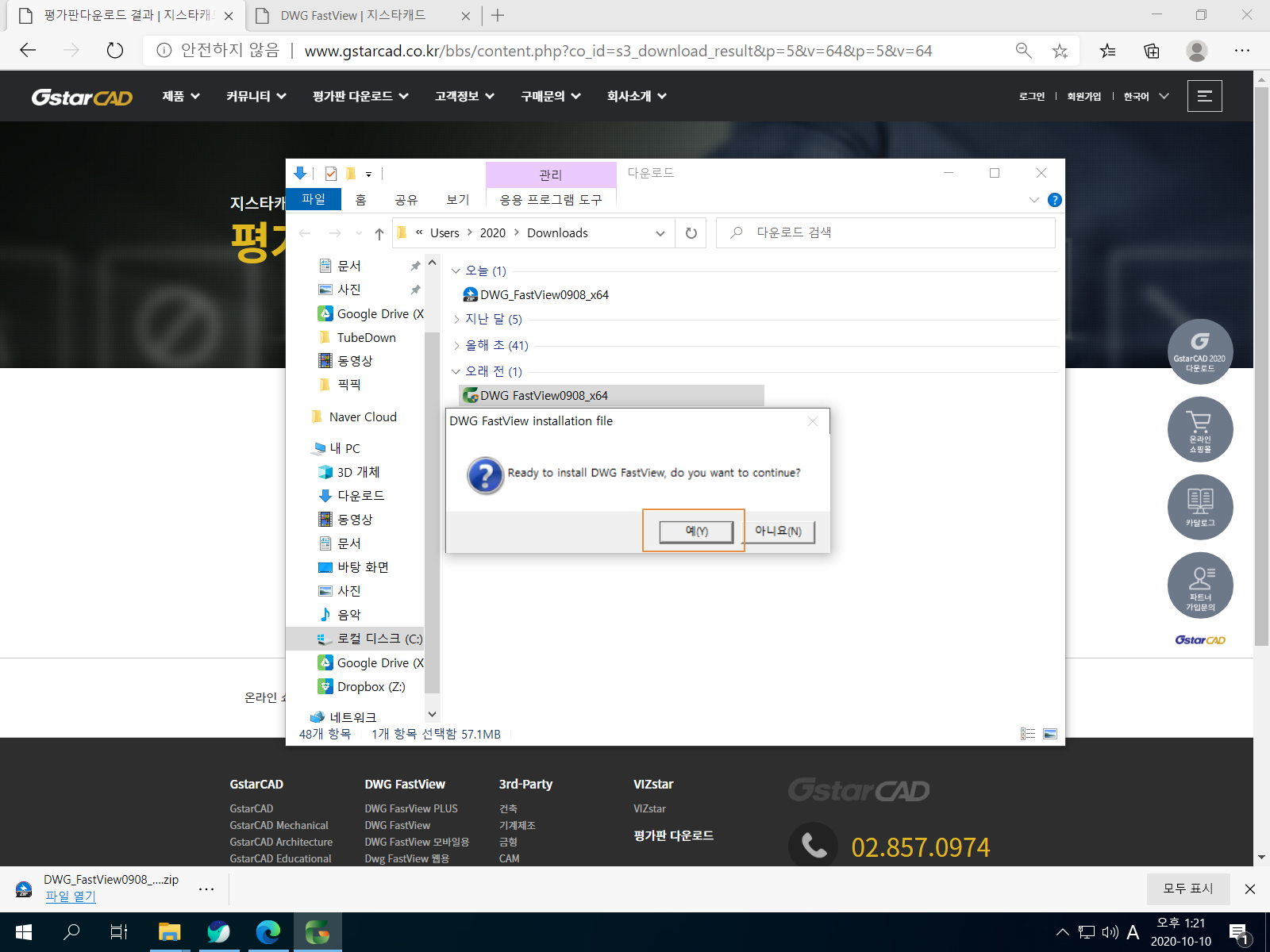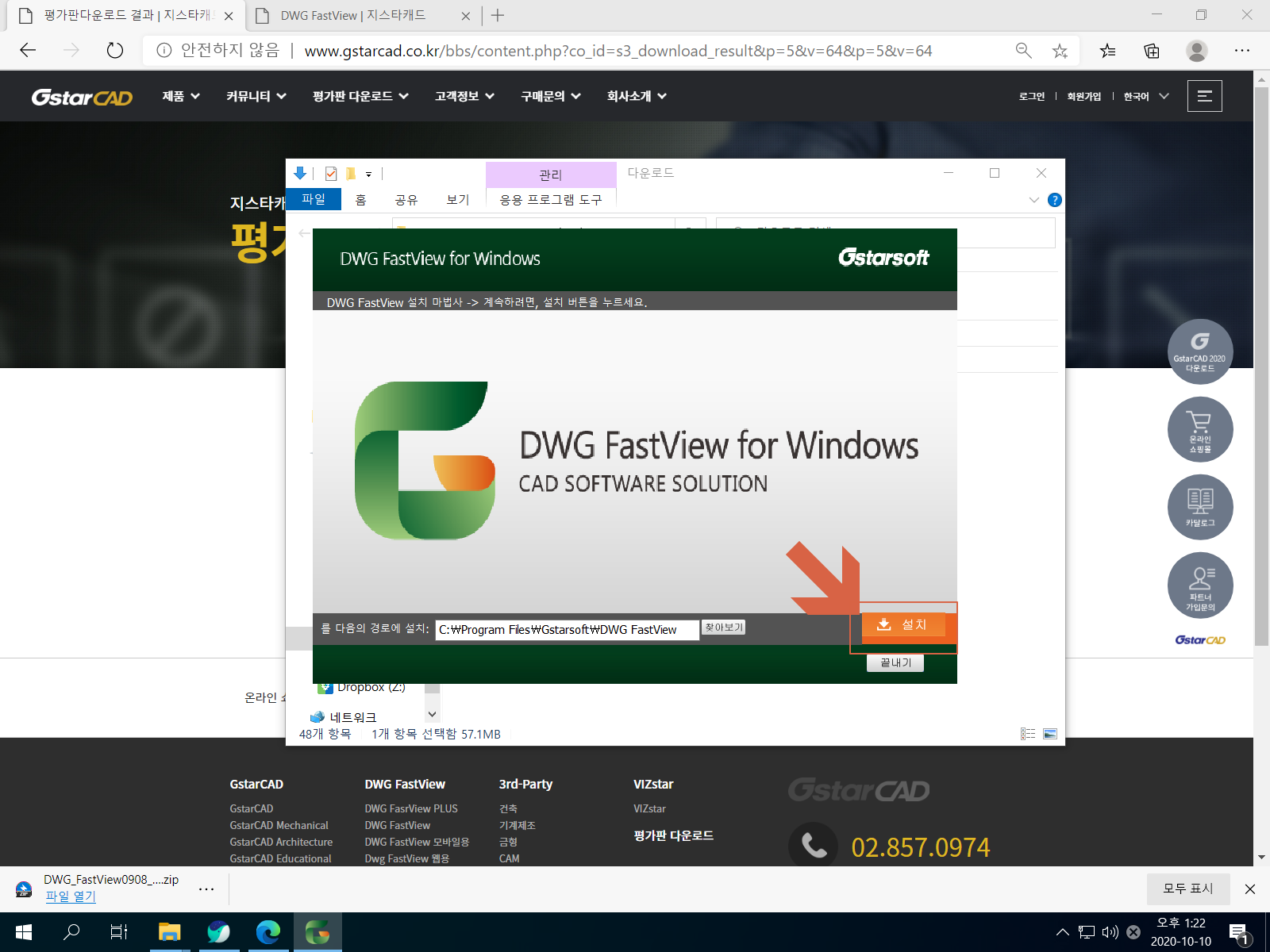 <64bit Download>를 누릅니다. DWG FastView 설치 파일 용량은 약 55MB입니다.