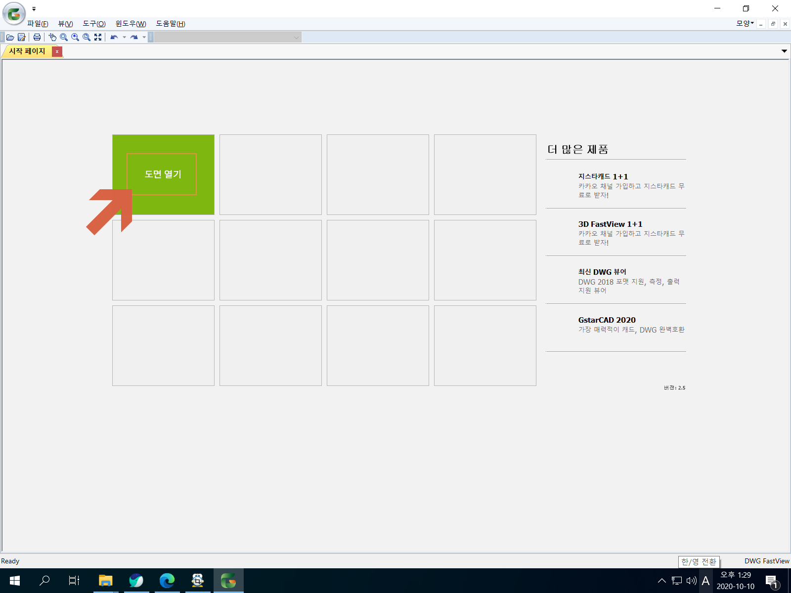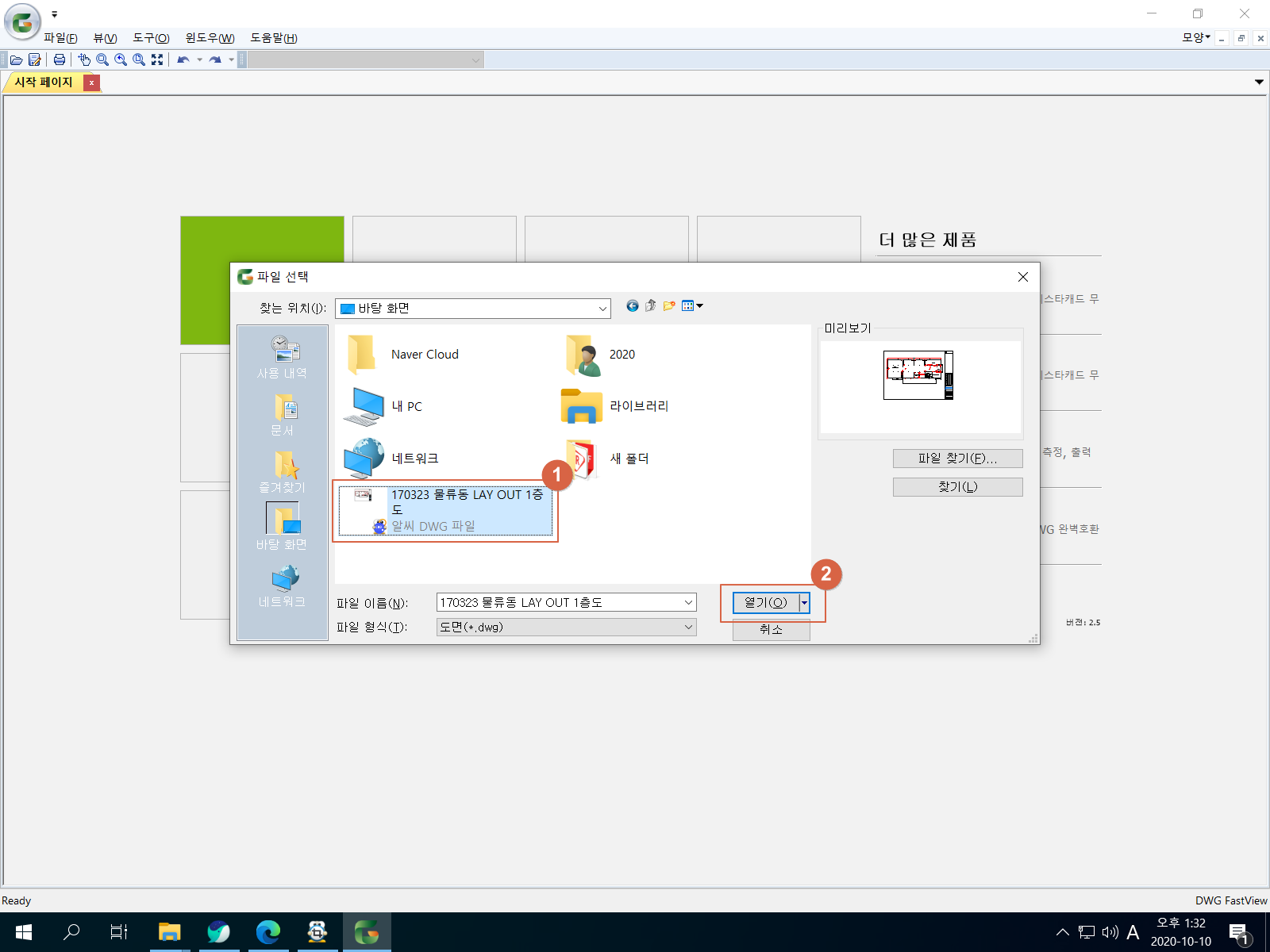 DWG 패스트뷰(FastView)가 실행되었습니다. <도면 열기>를 눌러서 도면 파일을 열어보도록 하겠습니다.