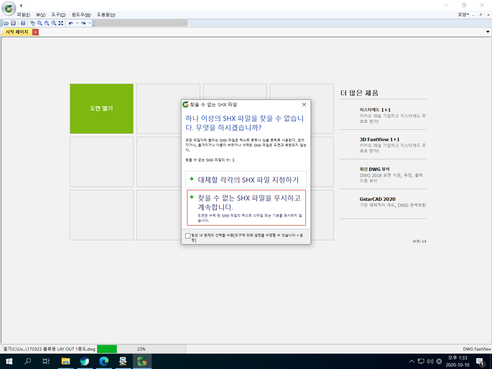 <찾을 수 없는 SHX 파일을 무시하고 계속합니다.>를 선택하고, DWG FastView는 한글로 설명이 나오므로 상당히 편리합니다.