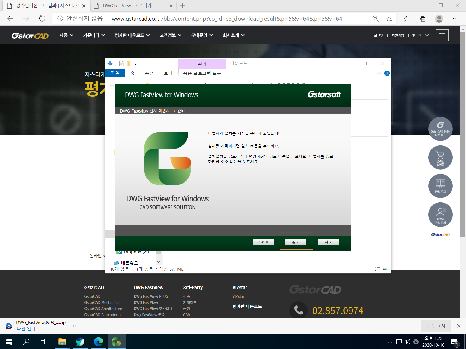 <64bit Download>를 누릅니다. DWG FastView 설치 파일 용량은 약 55MB입니다.