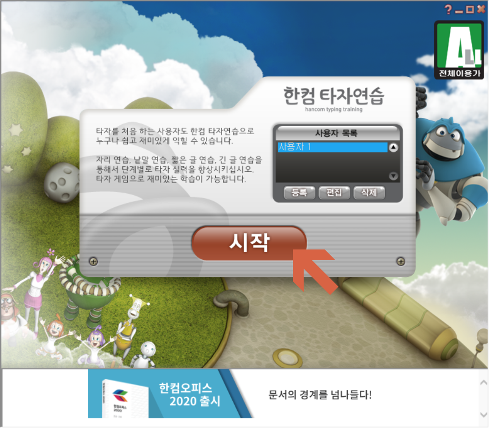 우리 모두에게 필요한 게임, 한컴 타자연습! - 한컴 타자연습은 타자를 처음 하는 분이나 타자능력을 향상하고 싶은 분 등 누구나 쉽게 즐길 수 있는 게임입니다. |