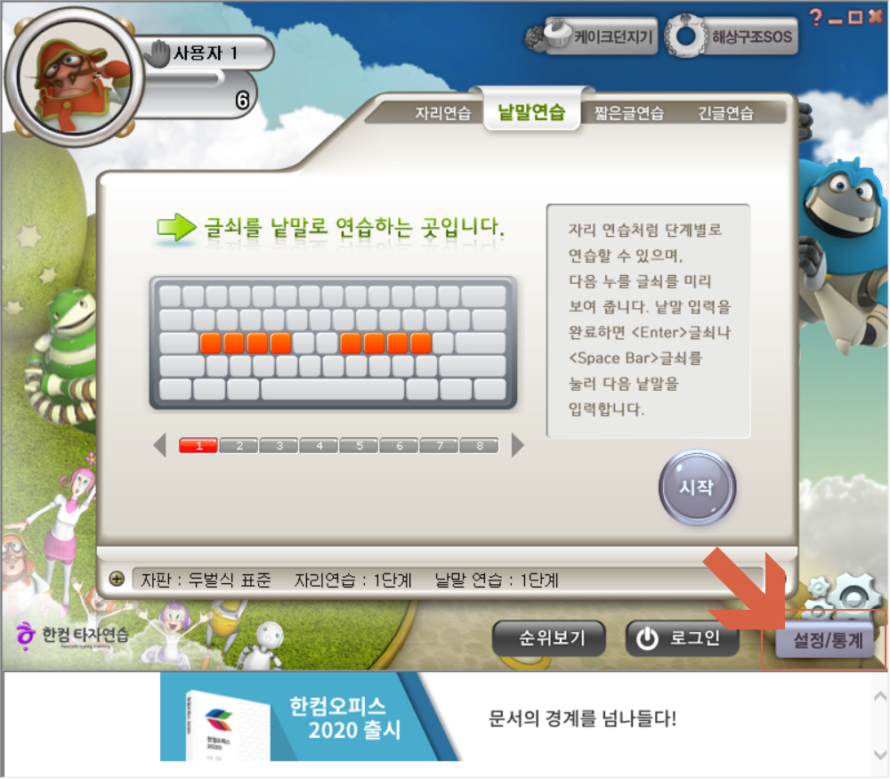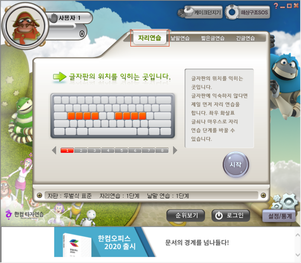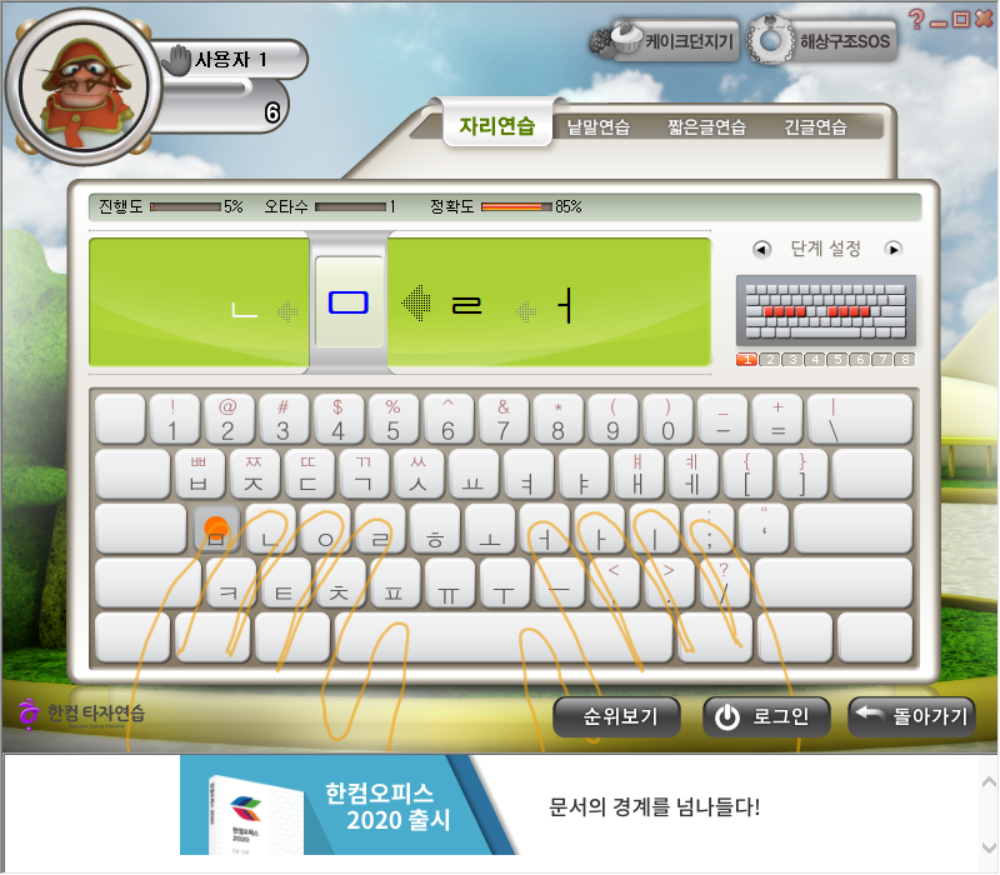 시작을 눌렀더니 자판 자리연습할 수 있는 단계로 나타납니다. 다시 자판 자리 연습을 하려니 어색하기도 합니다.