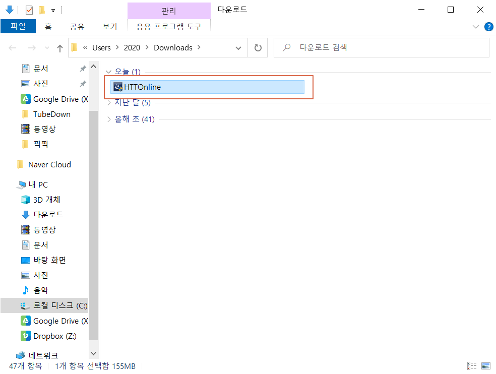 다운로드 폴더로 이동하면 한컴 타자연습 설치 파일이 보입니다. 설치 파일을 실행합니다.