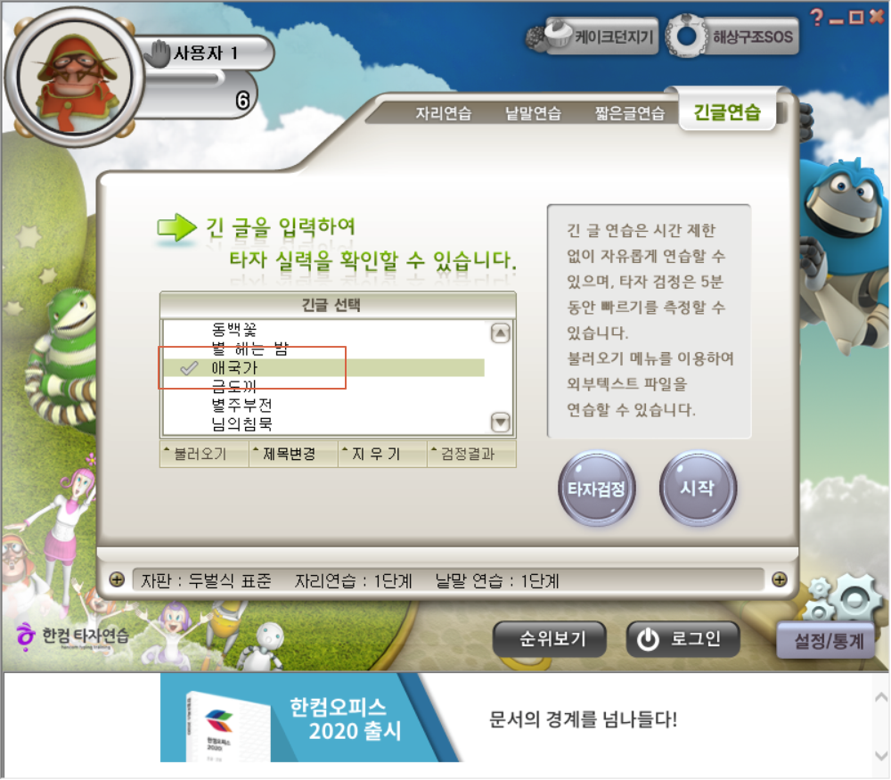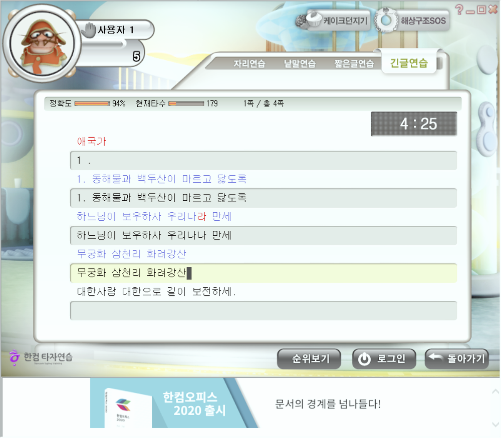긴 글 연습 메뉴에서 예전부터 자주 활용하던 애국가를 찾아보았습니다.