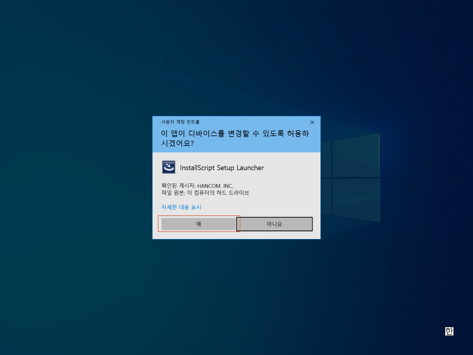 한컴 타자연습을 설치하려면 <예>를 누릅니다.