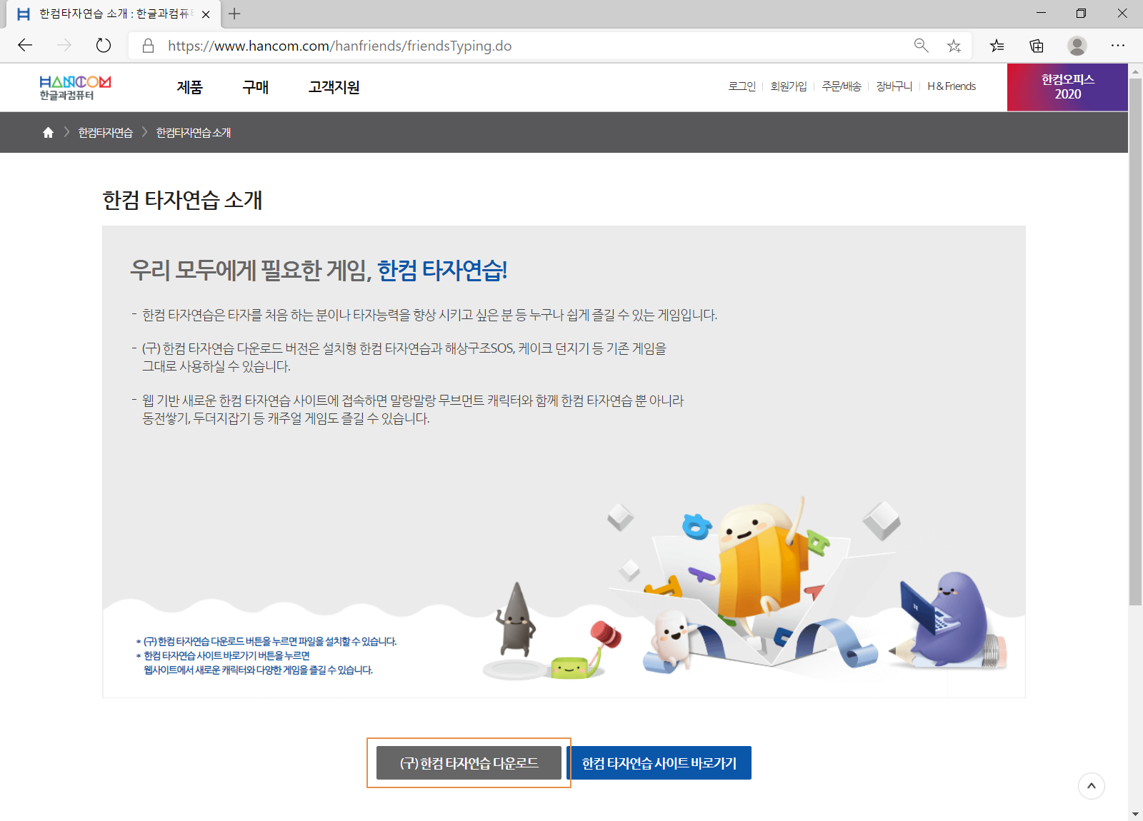 한컴 타자연습 다운로드 페이지로 이동합니다.