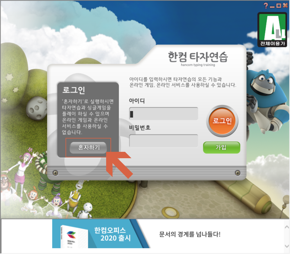 한컴 타자연습을 실행하면 로그인하여 온라인으로 사용자들과 같이 연습을 할 수도 있으며, 혼자 하기를 누르면 컴퓨터와 오프라인에서도 타자연습을 할 수 있습니다.