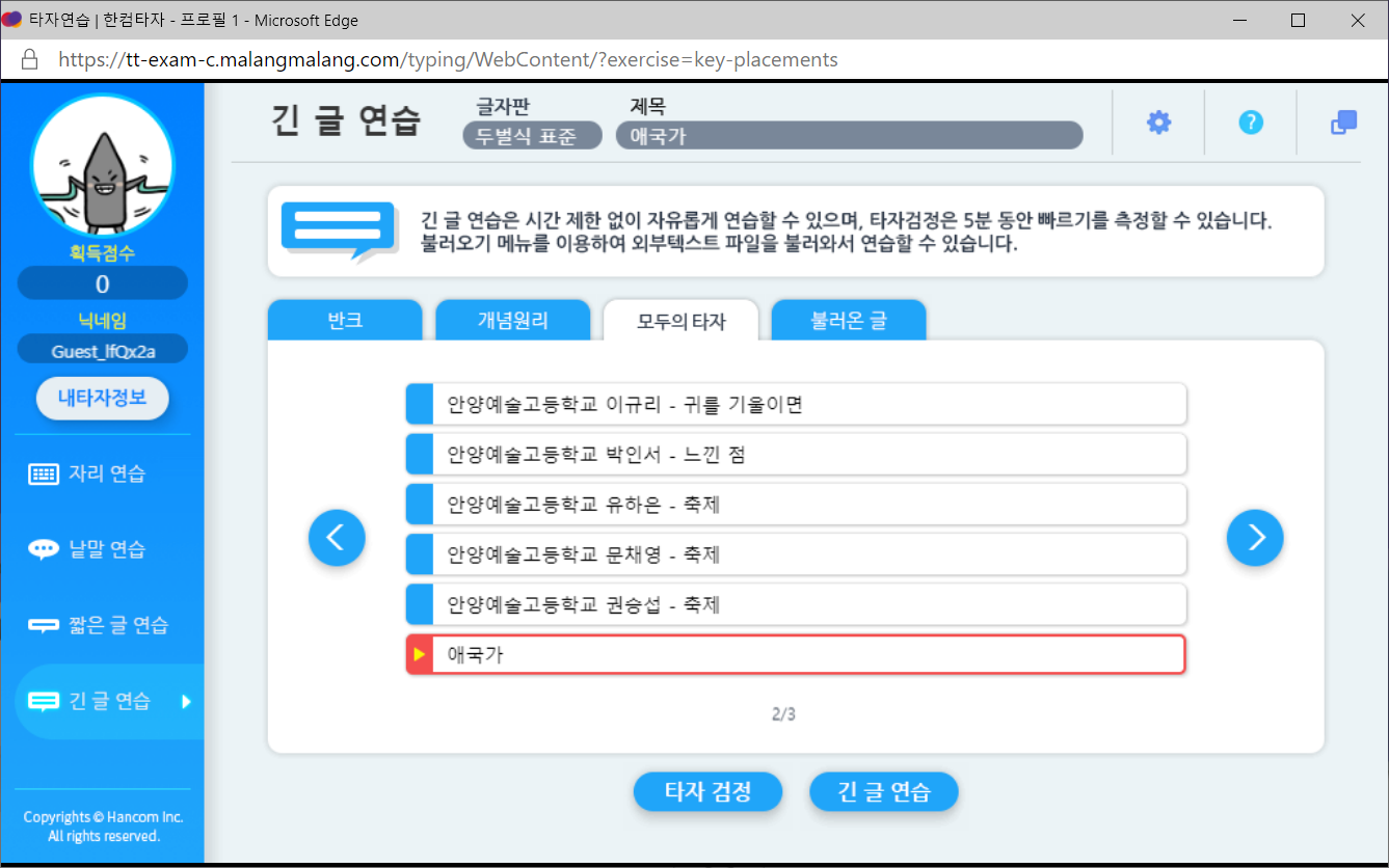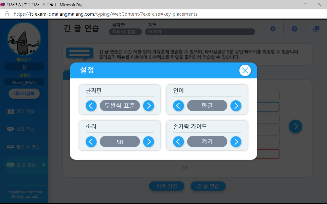 한컴 타자연습은 로그인을 하지않아도 게스트로 접속하면 전적이나 포인트 등이 기록되지 않습니다. 새로 키보드 사용을 배우는 사용자의 경우는 로그인하여 기록을 쌓아가면서 내 정보에서 목표와 통계를 확인할 수 있으니 꾸준하게 모니터링하는 것도 나쁘지 않지만 틈틈이 시간 될 때 연습할 계획이라면 게스트로 접속하여도 충분하다고 생각됩니다.
