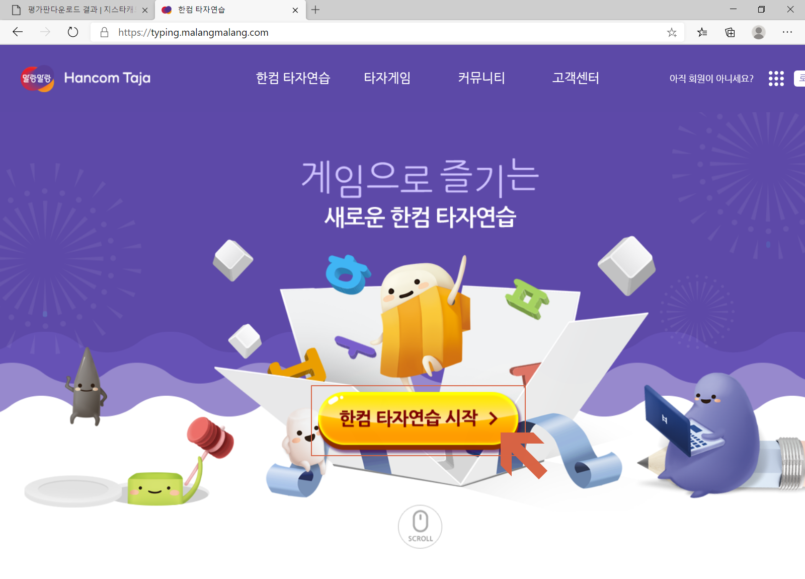 말랑말랑 플랫폼의 새로운 한컴 타자연습 사이트로 접속하며, 다운로드나 설치과정 없이 <한컴 타자연습 시작>을 누르면 바로 시작됩니다.