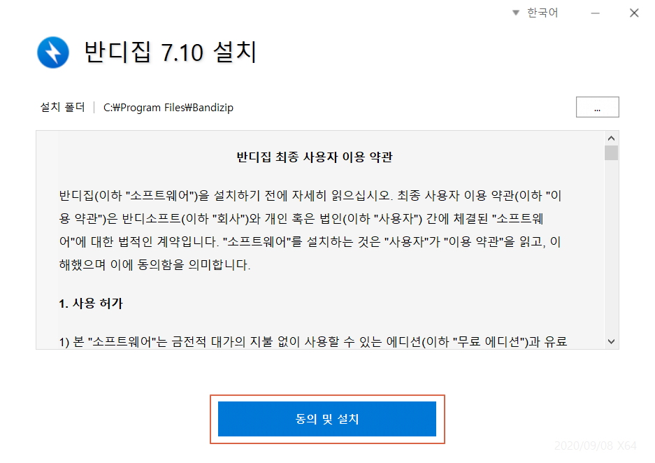 반디집(이하 "소프트웨어")을 설치하기 전에 자세히 읽으십시오. 최종 사용자 이용 약관(이하 "이용 약관")은 반디소프트(이하 "회사")와 개인 혹은 법인(이하 "사용자") 간에 체결된 "소프트웨어"에 대한 법적인 계약입니다. "소프트웨어"를 설치하는 것은 "사용자"가 "이용 약관"을 읽고, 이해했으며 이에 동의함을 의미합니다.